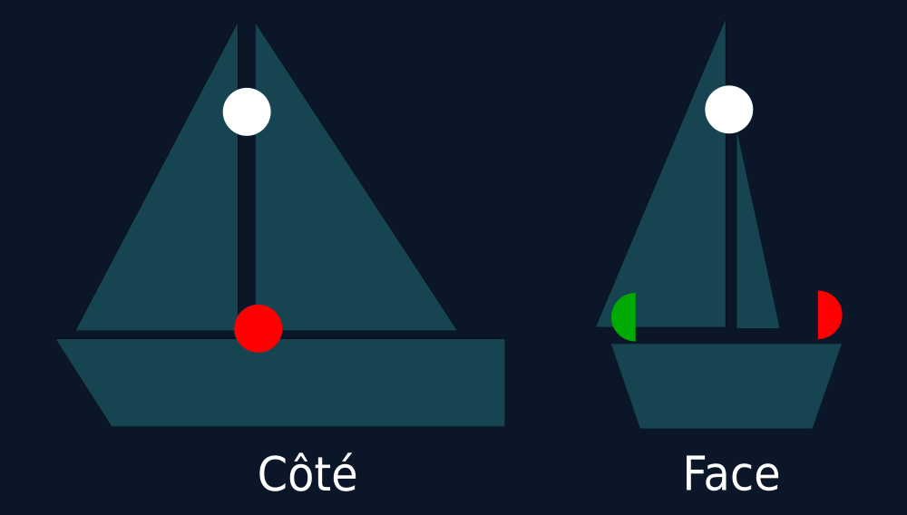 1 feu blanc à l'avant et à l'arrière sur tout l'horizon si le navire fait plus de 50m